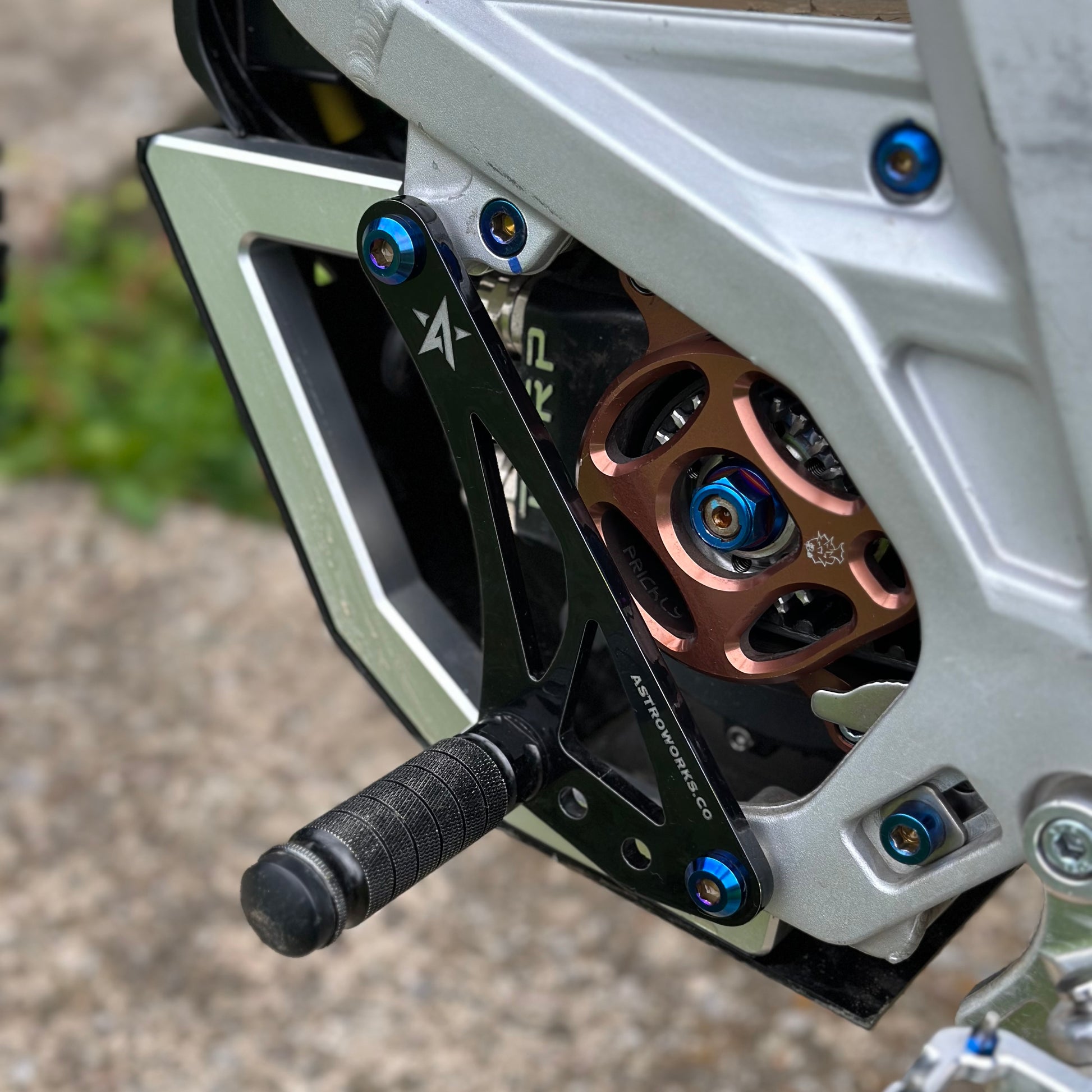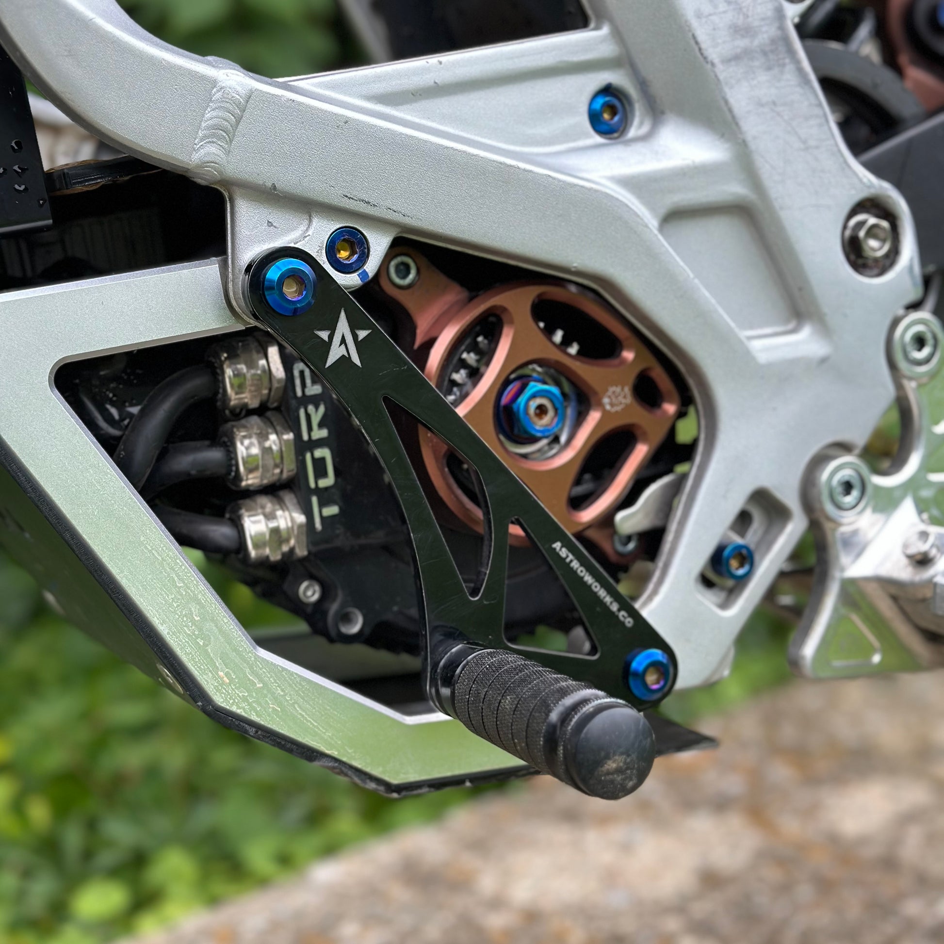 Burnt blue titanium bolts for these style shift locks installed on Surron Light Bee and Eride Pro.
